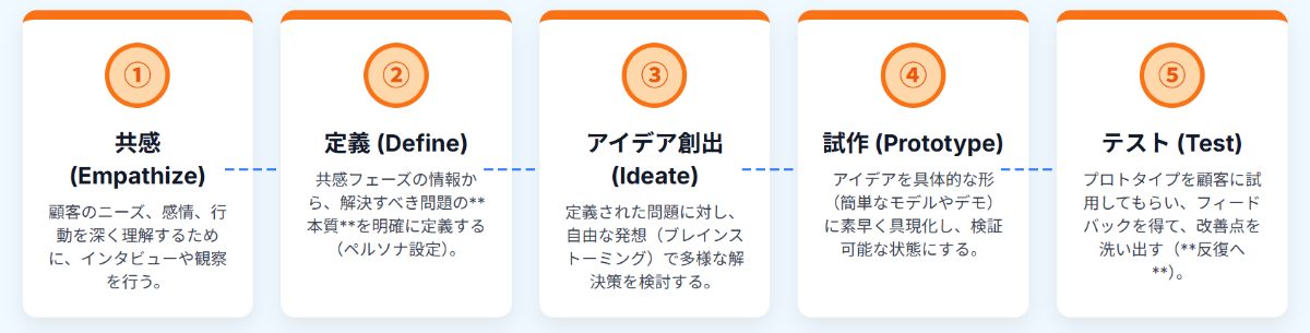 デザイン思考の中心にあるのは、ユーザーへの深い共感です。彼らの行動、感情、思考を理解し、未充足のニーズや潜在的な課題を発見することから始まります。次に、発見された課題を明確に定義し、解決すべき問題の本質を捉えます。そして、多様なアイデアを創出し、プロトタイプを作成してテストを繰り返すことで、最適なソリューションを導き出します。このプロセス全体を通して、常にユーザーの視点に立ち、改善を重ねることが重要です。
