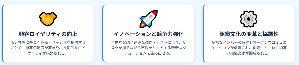 デザイン思考は、従業員の創造性と主体性を引き出し、オープンなコミュニケーションとコラボレーションを促進することで、組織文化を変革します。従業員の創造性と主体性を引き出し、オープンなコミュニケーションとコラボレーションを促進することで、組織全体のパフォーマンスを向上させます。デザイン思考のプロセスでは、多様なスキルや経験を持つメンバーがチームを組み、互いに協力して課題解決に取り組みます。