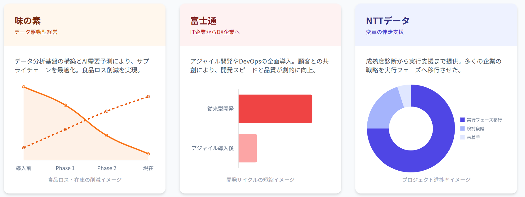 富士通は、長年にわたりITサービスを提供してきた経験を活かし、自社の組織文化を変革し、アジャイル開発やDevOpsなどの新しい開発手法を積極的に導入しています。顧客との共創を通じて、新たなビジネスモデルを創出しています。具体的には、顧客の課題を深く理解し、顧客と共に解決策を検討するワークショップを開催しています。また、アジャイル開発チームを組成し、顧客との密なコミュニケーションを通じて、迅速なシステム開発を実現しています。DevOpsの導入により、開発から運用までのプロセスを自動化し、システムの品質向上と開発期間の短縮を実現しています。組織文化の変革においては、従業員のチャレンジ精神を重視し、失敗を恐れずに新しいことに挑戦できる環境を整備しています。富士通の組織変革は、顧客との共創を通じて、新たな価値を創造し、社会課題の解決に貢献することを目的としています。組織全体の変革を推進し、持続的な成長を目指しています。