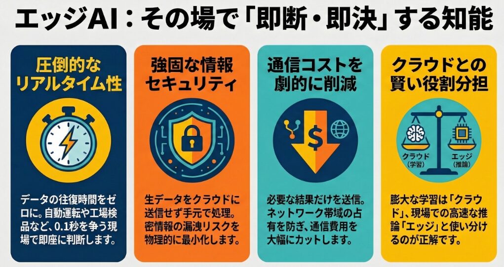 エッジAIのメリットは、低遅延、リアルタイム処理、情報セキュリティの向上、通信コストの削減などが挙げられます。特に、自動運転や工場における異常検知など、リアルタイム性が求められる分野で効果を発揮します。低遅延性は、エッジデバイスがデータが発生した場所の近くで処理を行うため、クラウドへのデータ送信にかかる時間を短縮できることに起因します。リアルタイム処理は、この低遅延性によって可能になり、瞬時の判断が求められる状況で重要な役割を果たします。情報セキュリティの向上は、機密性の高いデータをエッジデバイス内で処理することで、クラウドへの送信を最小限に抑え、データ漏洩のリスクを低減できるためです。通信コストの削減は、クラウドへのデータ送信量を減らすことで、ネットワーク帯域幅の使用量を減らし、通信費用を節約できることに繋がります。これらのメリットにより、エッジAIは、自動運転、スマートファクトリー、医療、小売など、さまざまな分野で活用されています。例えば、自動運転車では、エッジAIが瞬時に障害物を認識し、安全な運転を支援します。スマートファクトリーでは、エッジAIが製品の異常を検知し、生産ラインの停止を防ぎます。