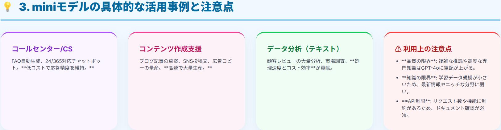 GPT-4ominiは、コストを抑えつつ、高速な応答速度を求めるユーザーに最適です。中小企業、個人開発者、スタートアップ企業など、リソースに制約のある環境でAI技術を活用したい場合に特におすすめです。GPT-4ominiは、GPT-4oほどの性能を必要としないが、ある程度の自然言語処理能力を必要とするユーザーに適しています。例えば、簡単なテキスト生成や要約、翻訳などのタスクであれば、GPT-4ominiで十分な結果を得ることができます。また、リアルタイムな応答速度が重要なアプリケーションにおいても、GPT-4ominiは有効です。中小企業や個人開発者は、GPT-4ominiを利用することで、初期投資を抑えつつ、AI技術を活用することができます。スタートアップ企業は、GPT-4ominiを利用することで、迅速にプロトタイプを開発し、市場投入までの時間を短縮することができます。GPT-4ominiは、リソースに制約のある環境で、AI技術を活用したいユーザーにとって、最適な選択肢となります。