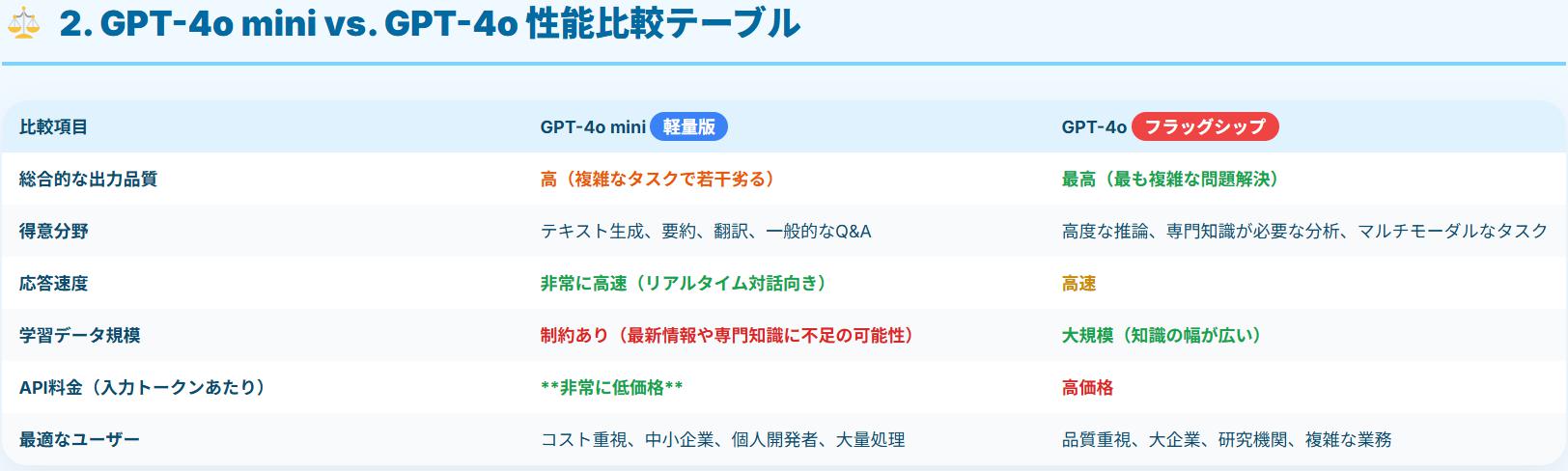 OpenAIが発表したGPT-4o miniは、GPT-4oの軽量版として注目を集めています。本記事では、GPT-4ominiとGPT-4oの違いを徹底比較し、その特徴、活用法、料金体系まで詳しく解説します。無料プランでの利用可否やAPI料金、具体的な活用事例まで網羅し、あなたのビジネスに最適な選択肢を見つける手助けをします。