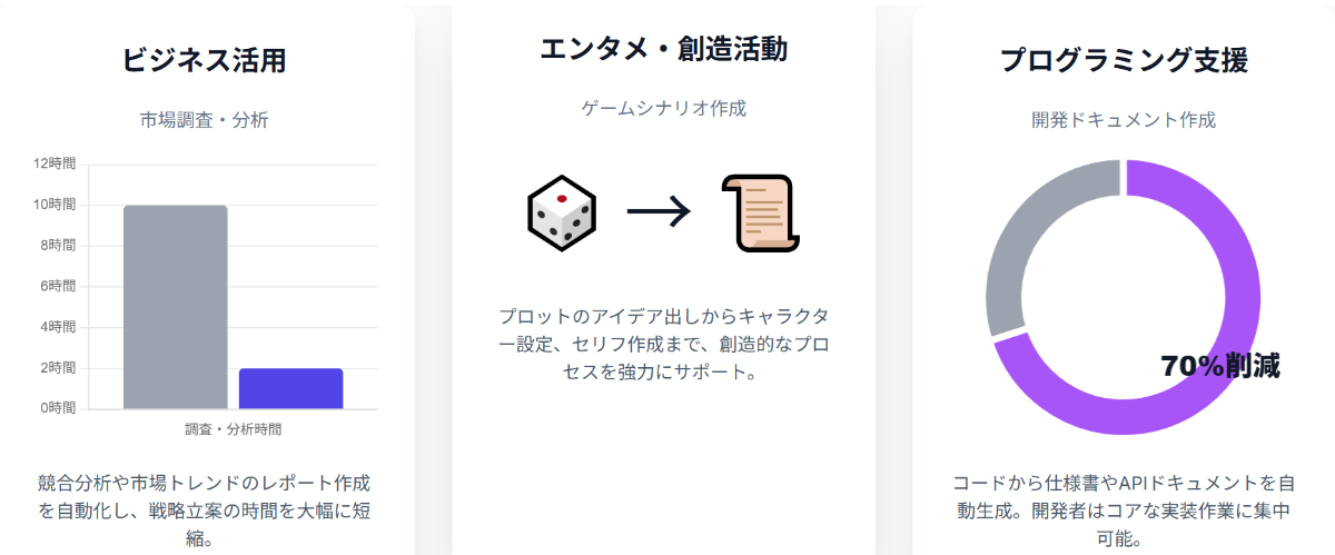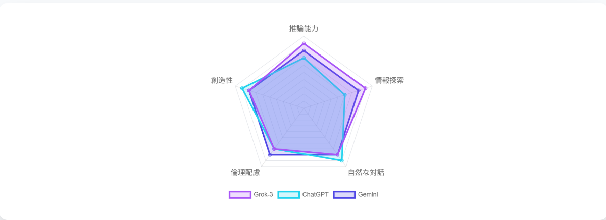ただし、それぞれのツールには得意分野があるため、用途に応じて使い分けることが重要です。 例えば、自然な文章生成が必要な場合はChatGPT、 Googleの検索エンジンとの連携が必要な場合はGemini、倫理的な配慮が必要な場合はClaude、 高度な推論能力と情報検索能力が必要な場合はGrok3、 といったように使い分けることができます。