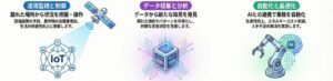 IoT機器とAI(人工知能)を組み合わせることで、 様々な業務を自動化し、効率を大幅に高めることができます。 例えば、製造プロセスの自動化では、 IoTセンサーで収集したデータをAIが分析し、生産ラインの各工程を自動的に制御することで、 生産効率を向上させることができます。 エネルギー消費の最適化では、 IoTセンサーで収集したデータをもとに、AIが最適なエネルギー消費量を予測し、 空調や照明などの設備を自動的に制御することで、 エネルギーコストを削減することができます。 在庫管理の自動化では、IoTセンサーで在庫状況をリアルタイムで把握し、 AIが最適な発注量を予測することで、 在庫不足や過剰在庫を防ぐことができます。 三菱電機のFA(FactoryAutomation)ソリューションでは、 IoT技術を活用して、 生産ラインの自動化を実現しています。 具体的には、 AIが生産設備の稼働状況を監視し、異常を検知した場合に自動的に停止したり、 最適な生産計画を立案したりすることで、 生産効率を大幅に向上させています。 このように、自動化と最適化は、様々な分野で活用されており、 人手不足の解消やコスト削減に貢献しています。