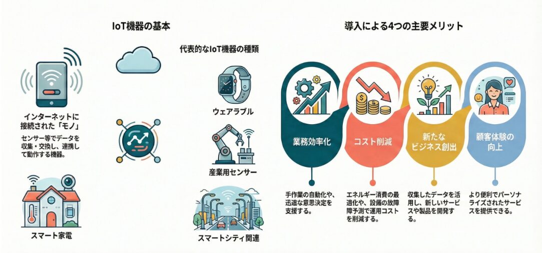IoT(Internet ofThings)機器は、私たちの生活やビジネスを変革する可能性を秘めています。この記事では、IoT機器の基本的な概念から、できること、種類、そして実際の活用事例まで、わかりやすく解説します。さらに、導入における課題やセキュリティについても触れ、IoT機器を安全かつ効果的に活用するための情報を提供します。