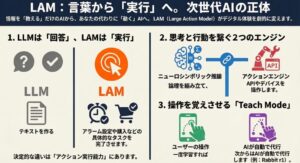 近年注目を集めるLarge ActionModel(LAM)。従来のLLMとは異なり、具体的なアクションを実行できる点が特徴です。この記事では、LAMの基本概念からLLMとの違い、活用事例、そして今後の展望までをわかりやすく解説します。