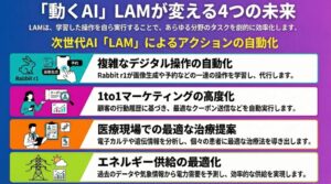 LLMはチャットボットやコンテンツ作成など、情報処理の分野で広く活用されています。一方、LAMは自動運転、ロボット制御、スマートホームなど、より物理的なアクションを伴う分野での活用が期待されています。LLMは、テキストベースの情報を処理するタスクに適しているため、カスタマーサポート、コンテンツ作成、情報検索などの分野で広く活用されています。一方、LAMは現実世界でのアクションを伴うタスクに適しているため、自動運転車、産業用ロボット、スマートホームデバイスなどの分野での活用が期待されています。たとえば、スマートホームのLAMは、ユーザーの指示に応じて照明を調整したり、エアコンを制御したり、セキュリティシステムを操作したりできます。このように、LAMは私たちの生活をより便利で快適なものにする可能性を秘めています。