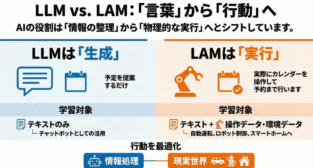 LLMは主にテキスト生成や翻訳といったタスクに特化していますが、LAMはそれに加えて、アプリケーションの操作やデバイスの制御など、より広範なタスクを実行できます。LLMの主な目的は、人間が理解できる自然なテキストを生成することです。そのため、質問応答、文章作成、翻訳などのタスクに優れています。一方、LAMはテキスト生成能力に加えて、現実世界でのアクションを実行できる点が大きな違いです。たとえば、LLMは「会議の予定を立てて」という指示に対して、会議の日時や場所を提案するテキストを生成しますが、LAMは実際にカレンダーアプリを操作して会議の予定を作成できます。このタスク実行能力こそが、LAMをLLMから区別する最も重要な要素です。