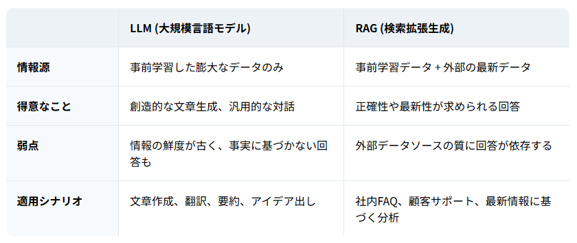 つまり、LLMは、トレーニングデータに依存したモデルであり、RAGは、外部データソースに依存したモデルと言えるでしょう。LLMは、トレーニングデータに含まれる情報しか扱えないため、最新の情報や専門的な知識が必要なタスクには適していません。一方、RAGは、外部データソースから最新の情報や専門的な知識を取得できるため、これらのタスクに適しています。