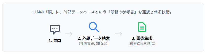 RAGは、ユーザーからの質問を理解し、関連する情報を外部データソースから検索します。検索された情報は、LLMに渡され、回答を生成するために使用されます。このプロセスにより、LLMは、トレーニングデータに含まれない最新の情報や専門的な知識に基づいた回答を生成することができます。