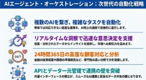 AIエージェント・オーケストレーションは、未来のビジネスにおいて不可欠な要素となると考えられます。企業は、AIエージェント・オーケストレーションの導入を積極的に検討し、未来のビジネスを切り拓くための準備を始めるべきです。