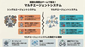 それに対し、マルチエージェントシステムは、タスクを複数のエージェントに分割し、並行して処理することで、より複雑な問題を効率的に解決できます。