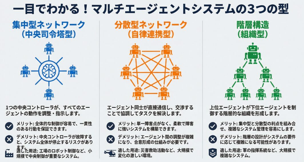 階層構造では、エージェントが階層的に組織され、上位のエージェントが下位のエージェントの動作を制御します。