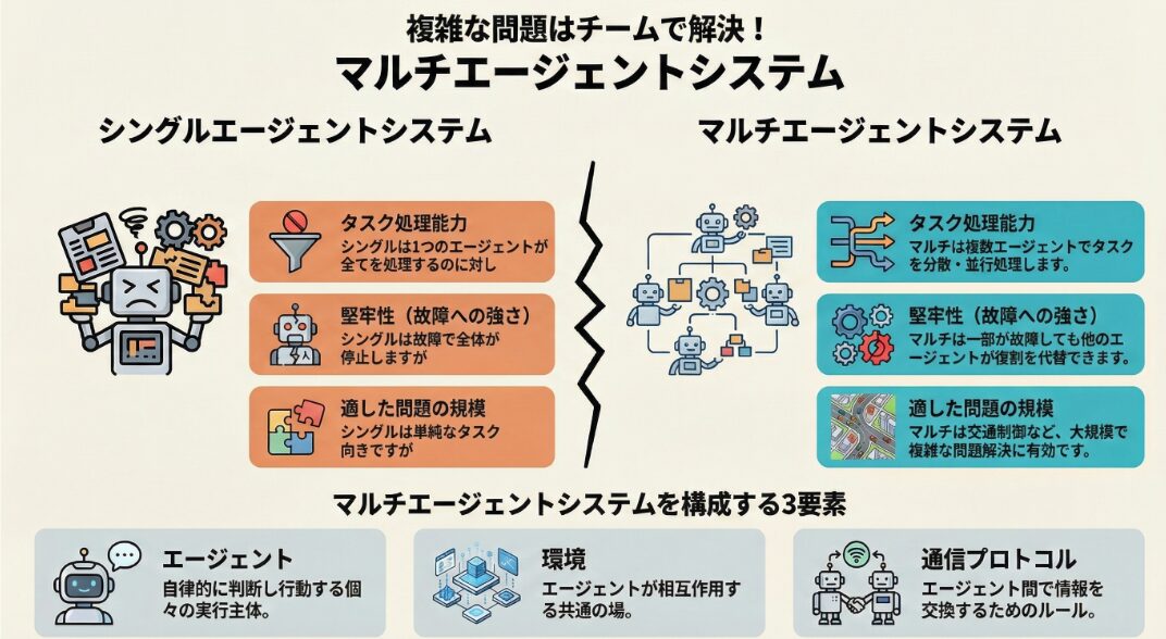 このように、マルチエージェントシステムは、シングルエージェントシステムに比べて、より高度な問題解決能力と柔軟性を持つことが特徴です。