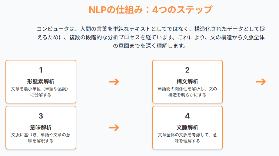 文章を単語や品詞などの最小単位に分解する処理です。これにより、文章の構造を解析し、意味を理解するための基礎を築きます。