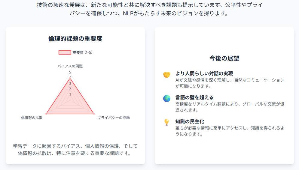 自然言語処理は、今後ますます発展していくことが期待されます。しかし、自然言語の曖昧さや、文化的な背景など、解決すべき課題も多く存在します。これらの課題を克服し、より高度な自然言語処理技術を開発することで、私たちの生活はより豊かになるでしょう。