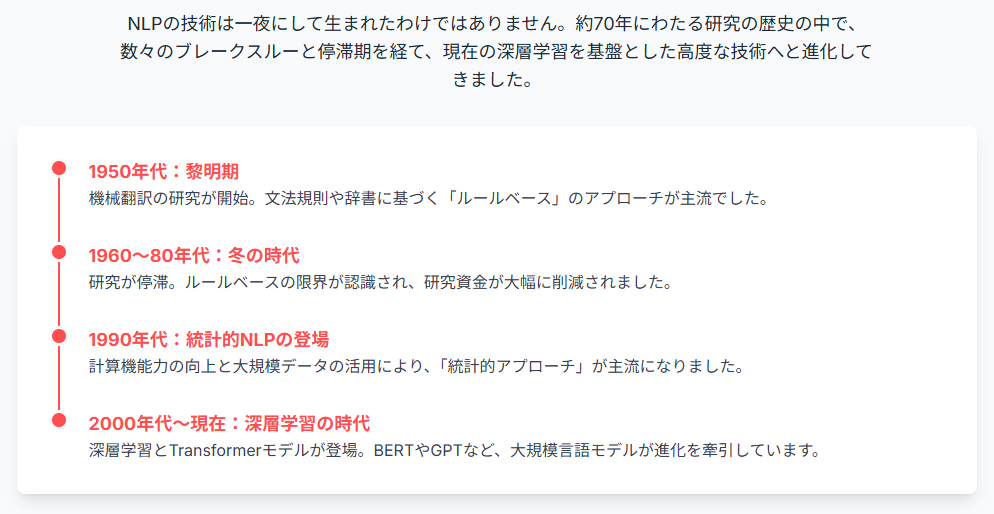 自然言語処理の歴史は、1950年代の初期の機械翻訳の研究に遡ります。第二次世界大戦後、冷戦時代に突入し、敵国の情報を迅速に収集・分析する目的で、アメリカを中心に機械翻訳の研究が盛んに行われました。この頃は、ルールベースのアプローチが主流であり、文法規則や辞書を用いて翻訳が行われていました。しかし、初期の機械翻訳システムは、精度が低く、実用的なレベルには達しませんでした。たとえば、ある有名な例として、「Thespirit is willing but the flesh is weak.」という英文をロシア語に翻訳し、それを再び英語に翻訳した結果、「Thevodka is good but the meat isrotten.(ウォッカは良いが、肉は腐っている)」という全く異なる意味になったという逸話があります。このエピソードは、当時の機械翻訳の限界を示すものとして広く知られています。