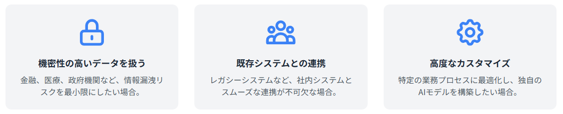 さらに、高度なカスタマイズが必要な場合も、オンプレミスAIが適しています。企業の独自のニーズに合わせてAIモデルを調整し、特定の業務プロセスに最適化することで、より高い効果を得ることができます。例えば、製造業における品質管理、小売業における顧客分析など、特定の目的に特化したAIシステムを構築したい場合に、オンプレミスAIが有効です。