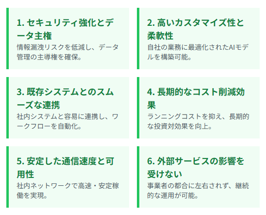 特に、AIが基幹業務に深く組み込まれている場合には、外部サービスの影響を受けないことが重要です。オンプレミスAIを導入することで、自社のビジネス戦略に基づいて、AIを柔軟に活用し、競争優位性を確立することができます。