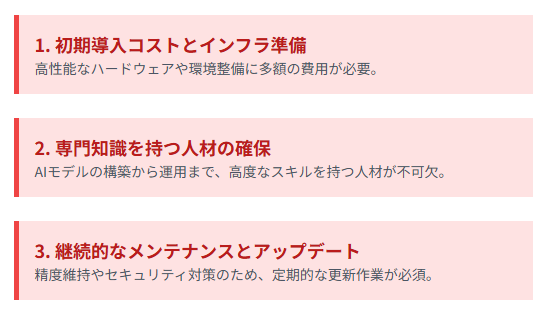 さらに、AIモデルの構築や運用に必要なソフトウェアのライセンス費用も考慮する必要があります。オープンソースのソフトウェアを利用する場合でも、技術サポートやカスタマイズには費用がかかる場合があります。初期導入コストを抑えるためには、必要なリソースを慎重に見積もり、段階的に導入を進めるなどの工夫が必要です。