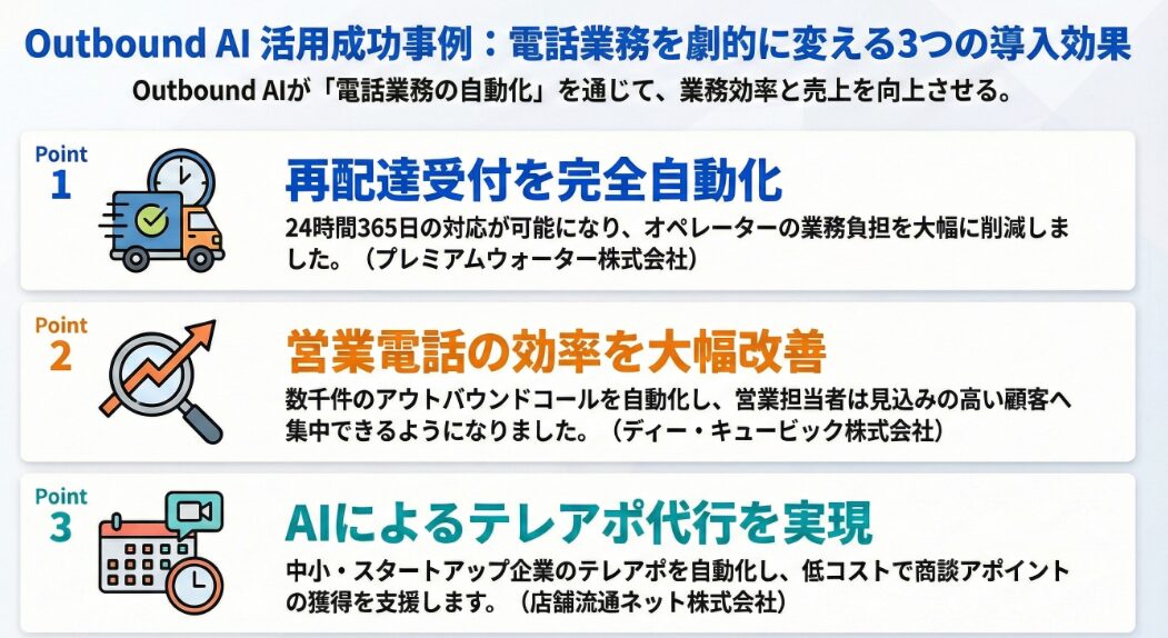 ディー・キュービック株式会社は、OutboundAIを導入し、数千件に及ぶアウトバウンドコールを自動化しました。従来、営業担当者が手動で行っていたアウトバウンドコールは、時間と労力を要する非効率な作業でしたが、OutboundAIの導入により、このプロセスを大幅に効率化することに成功しました。AIは、事前に設定されたスクリプトに基づいて顧客に電話をかけ、製品やサービスに関する情報を提供し、関心のある顧客に対しては、営業担当者への引き継ぎを行います。これにより、営業担当者は見込みの高い顧客に集中できるようになり、営業効率が大幅に向上しました。また、OutboundAIは顧客との対話内容を分析し、営業戦略の改善に役立つ貴重なデータを提供します。ディー・キュービックの事例は、OutboundAIが営業活動の効率化と売上向上に大きく貢献できることを示しています。