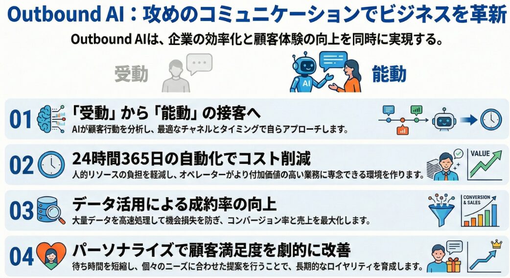 AIを活用したアウトバウンド戦略で、顧客エンゲージメントを向上させ、ビジネスを成長させる方法をご紹介します。事例や導入のヒントも満載。