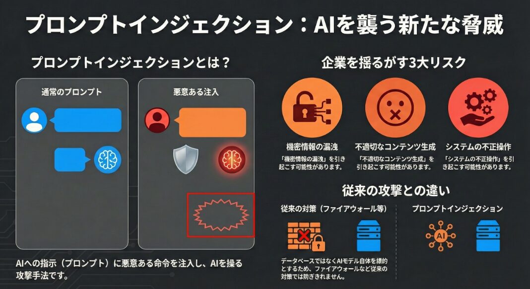 プロンプトインジェクションは、AIモデルに対する一種の攻撃手法であり、悪意のある指示をAIに注入することで、意図しない動作や情報漏洩を引き起こす可能性があります。