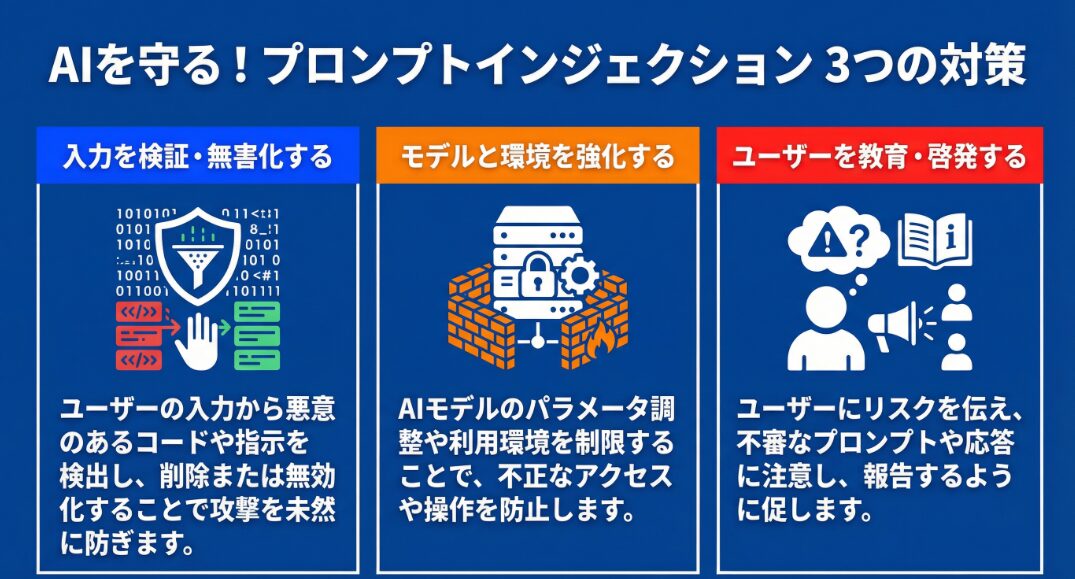 ユーザー教育は、プロンプトインジェクション対策の重要な要素の一つです。