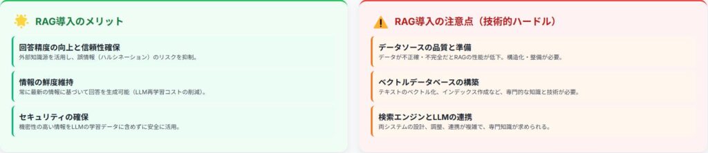 RAG(検索拡張生成)の導入には、いくつかの注意点があります。