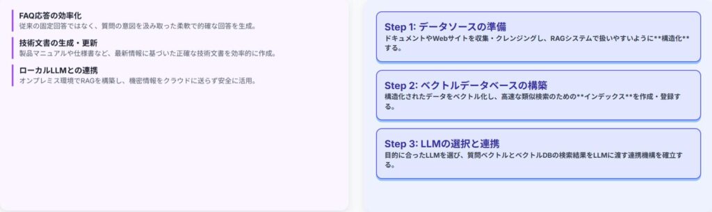 RAGを導入することで、LLMは外部の知識ソースから関連情報を検索し、その情報を基に回答を生成できるようになります。
