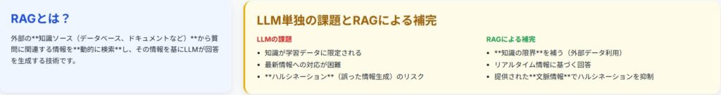 RAGは、LLMが持つ知識の限界を補完するために、外部の知識ソースから関連情報を検索し、LLMに提供する技術です。