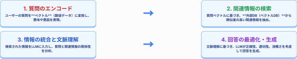 RAG(検索拡張生成)の仕組みは、質問応答システムにおいて、質問に基づいて関連する情報を外部のデータベースから検索し、その情報をLLMに提供することで、より正確な回答を生成するプロセスです。このプロセスは、大きく分けて以下の4つのステップで構成されます。