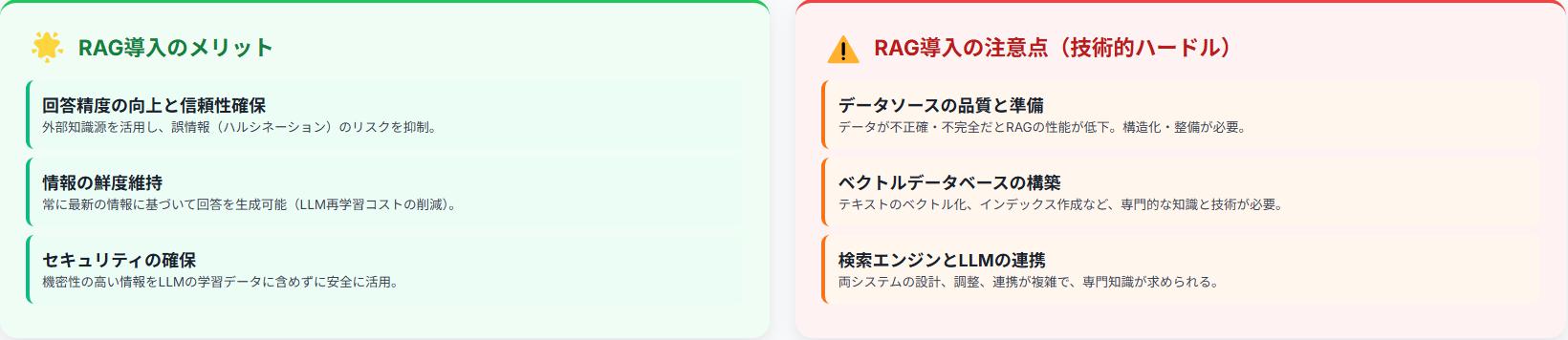 RAG(検索拡張生成)の導入には、いくつかの注意点があります。