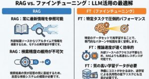 RAG(検索拡張生成)とファインチューニングは、それぞれ異なる特徴を持つ強力な手法であり、大規模言語モデル(LLM)の性能を最大限に引き出すための重要なツールです。RAGは、リアルタイムな情報更新が必要な場合や、特定のドメイン知識を容易に組み込みたい場合に適しています。