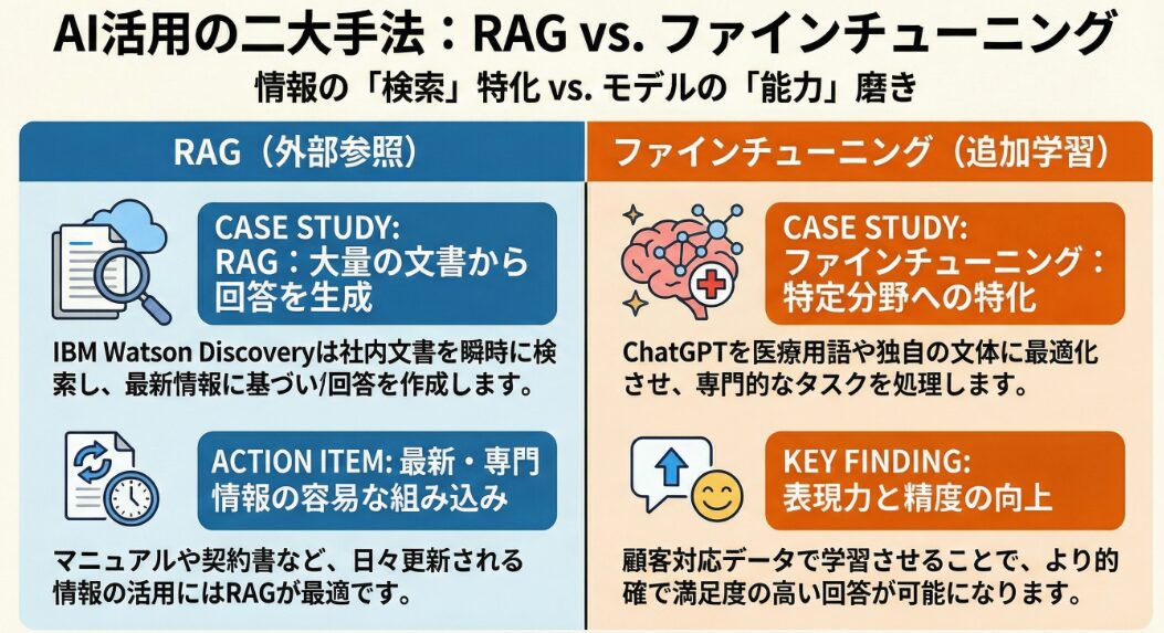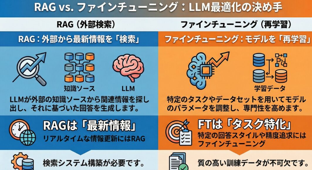 RAG(検索拡張生成)とファインチューニングは、それぞれ異なる特徴を持つ強力な手法であり、大規模言語モデル(LLM)の性能を最大限に引き出すための重要なツールです。RAGは、リアルタイムな情報更新が必要な場合や、特定のドメイン知識を容易に組み込みたい場合に適しています。