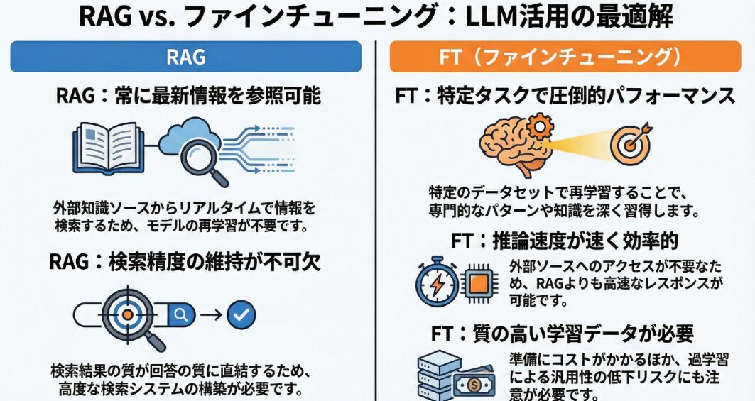 どちらの手法を選択するかは、プロジェクトの要件や利用可能なリソースによって異なります。リアルタイムな情報更新が必要な場合や、特定のドメイン知識を容易に組み込みたい場合はRAGが適しています。特定のタスクに特化した性能を求める場合は、ファインチューニングが適しています。