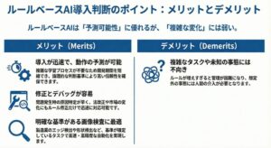 一方、デメリットとしては、複雑なタスクには不向きであること、ルールの作成とメンテナンスにコストがかかること、そして予期せぬ事態への対応が難しいことが挙げられます。