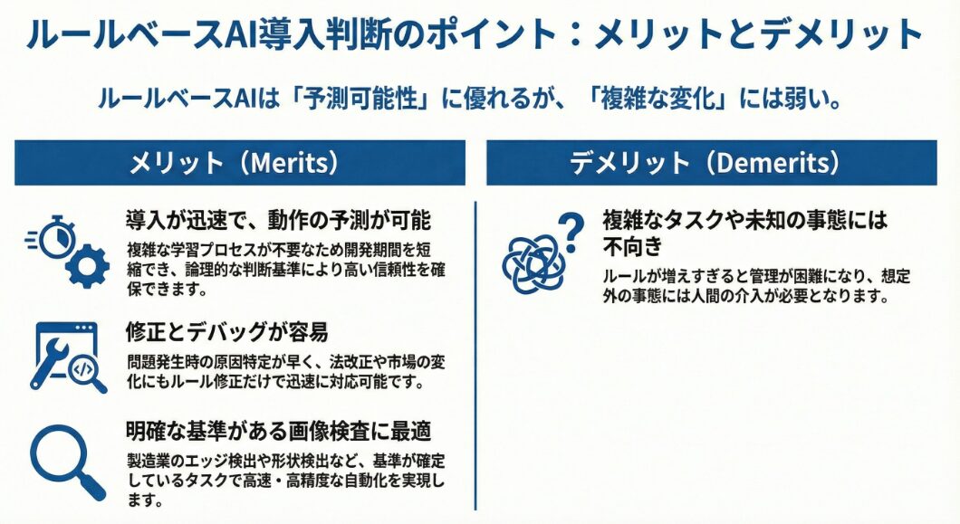 一方、デメリットとしては、複雑なタスクには不向きであること、ルールの作成とメンテナンスにコストがかかること、そして予期せぬ事態への対応が難しいことが挙げられます。