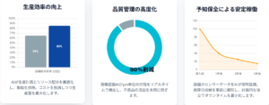AIを活用した画像認識やデータ分析により、製品の欠陥を早期に発見し、品質を向上させます。例えば、四国化工機では画像認識AIで検品作業の自動化を実現しています。具体的には、製品の表面の傷や汚れ、異物の混入などをAIが自動的に検出し、不良品を排除します。また、AIは過去のデータに基づいて、品質に影響を与える要因を特定し、事前に対策を講じることができます。例えば、温度や湿度、原材料の配合などが品質に与える影響を分析し、最適な条件を維持することができます。さらに、AIは検査員のスキルや経験に依存せず、常に安定した品質検査を行うことができます。これにより、検査員の負担を軽減し、人的ミスのリスクを減らすことができます。品質管理の高度化は、顧客満足度の向上やブランドイメージの向上につながります。また、不良品の発生を減らすことで、資源の無駄遣いを防ぎ、環境負荷を低減することも可能です。AIを活用した品質管理は、スマートファクトリーにおいて不可欠な要素と言えるでしょう。