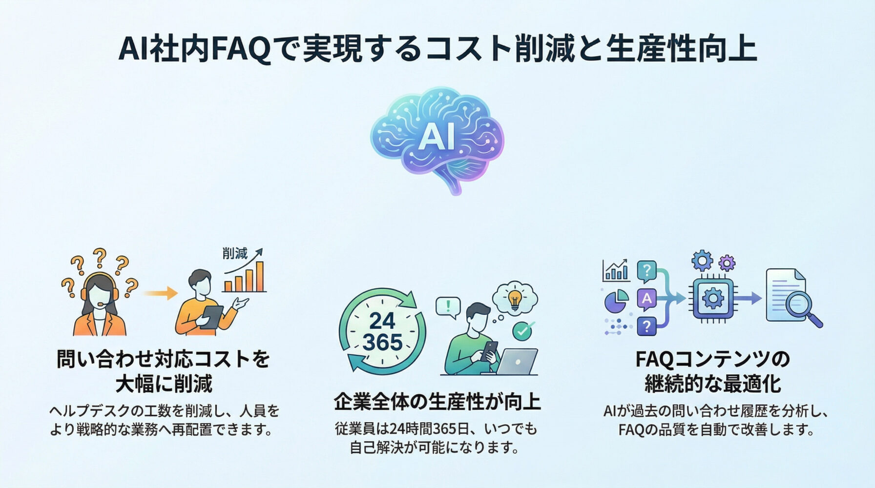 AIを社内FAQに導入することで、問い合わせ対応コストの大幅な削減が期待できます。従来、従業員からの質問に humanリソースで対応していた場合、その時間と労力は膨大なものになります。AIがFAQを自動生成・更新することで、FAQ作成・管理にかかる工数を削減できます。従業員は自己解決できるため、ヘルプデスクへの問い合わせ件数が減り、担当者の負担を軽減できます。AIチャットボットが24時間365日対応することで、時間や場所にとらわれず、従業員は必要な時に必要な情報を得ることができ、結果として、企業全体の生産性向上に繋がります。問い合わせ対応に費やしていた人員をより戦略的な業務に集中させることが可能となり、組織全体の効率化にも貢献します。さらに、AIは過去の問い合わせ履歴を分析し、FAQの内容を最適化するため、継続的なコスト削減効果が期待できます。