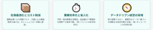 過剰在庫による保管コストや、欠品による販売機会損失を削減します。適切な在庫量を維持することで、キャッシュフローの改善にもつながります。需要予測AIは、過去の販売データや市場動向を分析し、将来の需要を正確に予測することで、適切な在庫量を算出します。これにより、過剰な在庫を抱えるリスクを減らし、保管コストを削減することができます。また、欠品による販売機会損失を防ぎ、顧客満足度を向上させることができます。さらに、需要予測AIは、サプライチェーン全体での在庫最適化を支援し、リードタイムの短縮や輸送コストの削減にも貢献します。在庫最適化は、企業の収益性向上に不可欠な要素であり、需要予測AIはその実現を強力にサポートします。