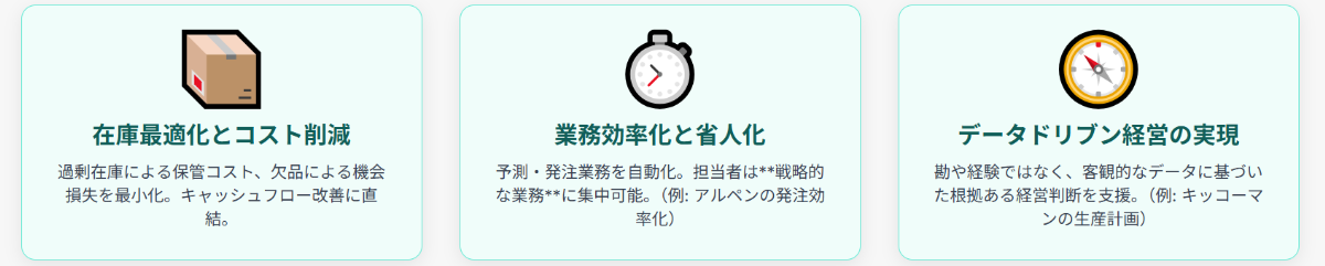 客観的なデータに基づいた意思決定を支援し、勘や経験に頼らない、根拠のある経営判断を可能にします。キッコーマンでは、生産計画の最適化に活用されています。需要予測AIは、過去の販売データ、市場トレンド、外部要因など、様々なデータを分析し、客観的な予測結果を提供します。経営者は、この予測結果に基づいて、根拠のある意思決定を行うことができます。例えば、新商品の投入時期や価格設定、販売戦略などを、データに基づいて決定することができます。これにより、勘や経験に頼る経営から脱却し、より科学的な経営を実現することができます。データドリブン経営は、企業の成長を加速させるための重要な要素であり、需要予測AIはその実現を強力に支援します。